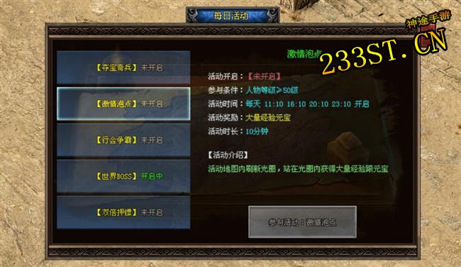 活动时间在每日11:10、16:10、20:10、23:10开启,持续10分钟。50级及以上就可以参与啦!活动开启后,地图内会出现5个光圈特效,站在光圈内就能获得元宝与经验加成。中间核心光圈是5倍奖励,这可是“兵家必争之地”,大家一定要全力争夺,就像一群勇士为了宝藏而战斗!四周其余光圈是2倍奖励加成,也能助力你快速积累资源,让你在传奇世界里“富得流油”。